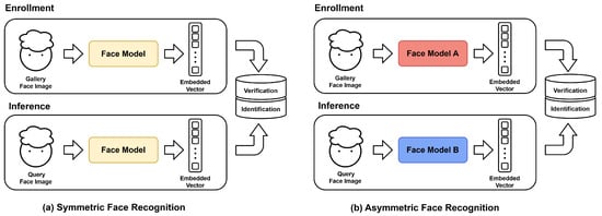 Deep-learning-based face recognition systems typically rely on a single model to generate embeddings for both gallery and query images, a method commonly referred to as symmetric face recognition [4,5,6,7,8]. This approach is highly effective in controlled environments where the same model is consistently employed across all devices. However, relying on a single model is not always feasible in real-world scenarios. Instead, multiple devices often utilize different models to meet computational and memory constraints. For instance, resource-limited edge devices (e.g., smartphones) may adopt lightweight models to minimize computational overhead and memory usage. In contrast, high-performance servers or cloud infrastructures can employ larger and more complex models to maximize the accuracy of face embedding extraction. Such heterogeneous cross-device authentication scenarios commonly arise in financial systems, access control, and IoT ecosystems. Ensuring seamless interoperability in these settings is critical for user convenience and security. Consequently, when designing face recognition systems, it is imperative to account for various model and device environments to provide accurate and consistent embedding compatibility across different models. This variation introduces challenges, as embeddings generated by one model may not align perfectly with those from another, leading to performance degradation and inconsistencies. The illustration of differences between symmetric and asymmetric face recognition is shown in Figure 1.