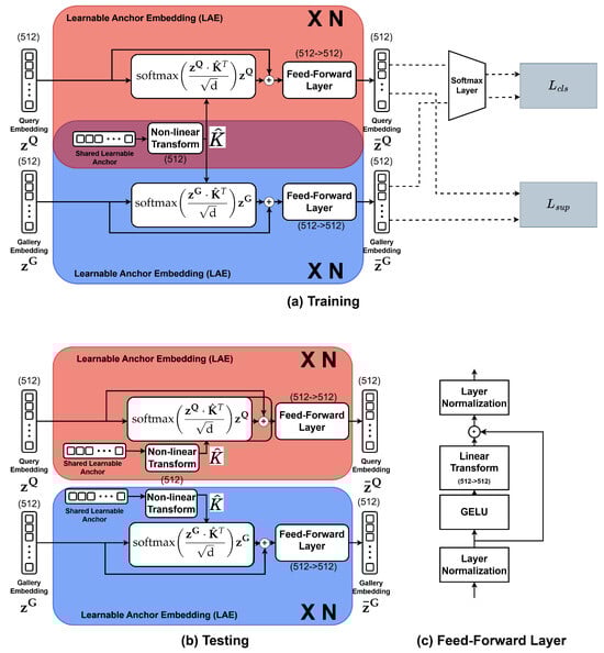 The proposed LAE model: (a) The SLA is shared during the training stage. (b) The SLA is used separately for the query and gallery during inference. (c) Feedforward layer. represents the classification loss, and denotes the supervised contrastive loss. Parentheses indicate dimensions, and the arrow (->) symbolizes transformation.