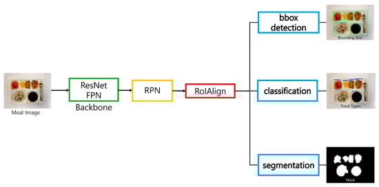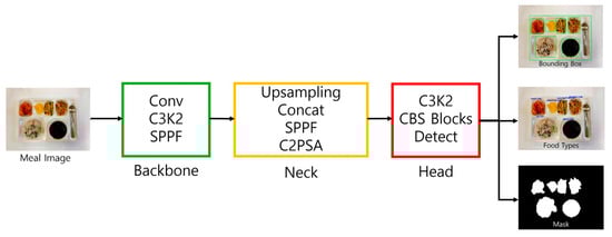 The proposed method detects food items in an image through Mask R-CNN [] or YOLOv11 []. Mask R-CNN detects objects through two stages for region proposal and object detection, so this model can achieve precise and detailed food identification. On the other hand, YOLOv11 integrates region proposal and object detection into a single network to detect objects faster than Mask R-CNN.