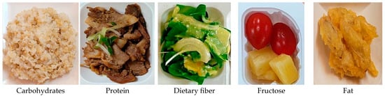 The GI database does not contain the GIs of all foods. Therefore, it may be difficult to determine an accurate GI for certain foods in the image. To address this issue, the missing GI is estimated by referencing the corresponding food category. The foods are classified into dietary fiber, protein, fat, carbohydrate, and fructose. Although dietary fibers and fructose are found in small amounts in foods, they significantly impact blood sugar increases. Therefore, the food classes of vegetables and fruits are categorized as dietary fiber and fructose, respectively, based on the nutrients they contain. For the others, the category is determined as one of protein, fat, and carbohydrate based on their primary nutrients. Figure 4 shows food samples for the categories and Table 1 presents the determination of food categories for some foods in the database. The median GIs for the food categories are obtained from the foods in the GI database. Table 2 presents the number of foods, minimum GI, maximum GI, and median GI for the food categories. When the GI of a certain food is not found in the database, the corresponding category is determined by referencing its food nutrients and class, which are searched through a food nutrition information API (Application Programming Interface) []. Subsequently, the GI is determined as the median value of the corresponding category.