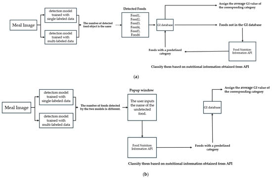 The foods in the image are sometimes not found through the food detection model. The food region may be detected through the model with the common label but its type may not be detected. In addition, the type of food may be identified, but its corresponding GI may not be found in the database. For universal application, the recommendation system must be able to address both scenarios. In other words, the system must include functions to estimate the GI of unknown foods. Figure 5 shows two flows for addressing these scenarios. The first scenario is that both detection models, which are trained with multi-labels and the common label, respectively, detect the food objects, but GIs of some foods are not found in the database as shown in Figure 5a. The GIs are determined by searching food information through the food nutrition information API. Another scenario is in the case of detecting certain foods only by the model trained with the common label as shown in Figure 5b. In this scenario, these food names are inputted manually. The GIs are found in the database or through the food nutrition information API. After obtaining the food nutrition information, the foods are classified into the food categories, then the median GI of the corresponding category is assigned to the food for suggesting the food intake order recommendation. For foods within the same category, the intake order is determined based on their carbohydrate content, ranked from lowest to highest.
