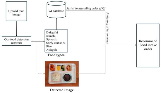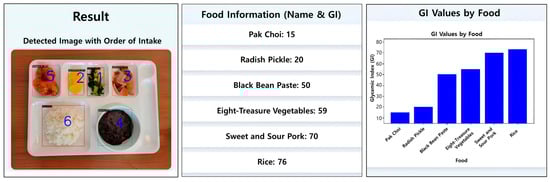 High GI foods cause rapid and pronounced spikes in blood sugar levels in a short time, leading to sharp fluctuations that can affect energy levels and metabolic stability. In contrast, low GI foods raise blood sugar more slowly and gradually. Therefore, low GI foods can provide a more sustained energy release and reduce the risk of blood sugar variability []. In other words, consuming low GI foods first can more effectively manage the rise in blood sugar. Blood sugar spikes can be prevented by consuming fiber-rich vegetables first []. Therefore, the GI is utilized as a criterion to determine the food intake order to prevent blood sugar spikes. After detecting foods through the food detection model, the GIs corresponding to the foods are found in the public food database []. Then, the food intake order is presented in ascending order based on their food GIs. The suggested food intake order by the proposed method can help delay the rise in blood sugar for preventing blood sugar spikes.