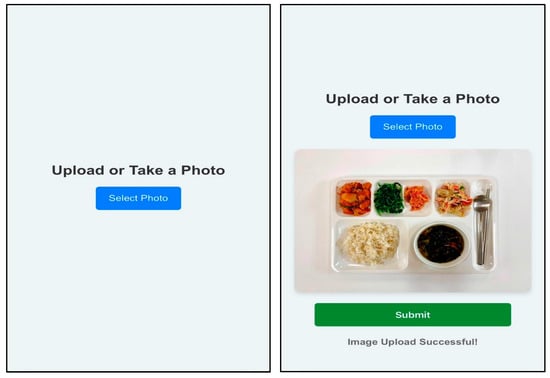 Figure 7 provides image upload and preview interfaces. These interfaces are implemented using HTML5, CSS3, and JavaScript. When the user interacts with the ‘Select Photo’ button, a stored food image can be selected or a new food image can be captured. The food image is previewed and sent to the server when the user clicks the ‘Submit’ button. The web application is designed to optimize the mobile user experience, featuring CSS transitions for smooth visual feedback during interactions.