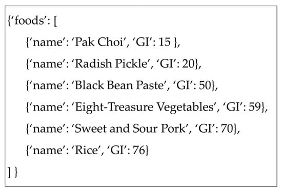 Previous research has been conducted for food intake recommendations. A study [] proposed a health management method to suggest personalized dietary plans based on health conditions, medical history, and nutritional needs. An intake recommendation system [] provided users with a personalized and healthy meal, taking into account both preferences and medical prescriptions. An ontology-based food recommendation system used semantic web technologies to generate personalized meal plans based on health conditions, preferences, and allergies []. A nutrition and preference-based system combined collaborative and content-based filtering to recommend meals aligned with health goals []. An ontology-based system for elders [] has been proposed to connect health conditions (e.g., hypertension, diabetes) to medical data for providing personalized nutritional plans. A diabetes management app analyzed real-time blood glucose levels to suggest low-carbohydrate, high-fiber diets for effective health management []. However, these previous studies did not provide a food intake order for blood sugar management.