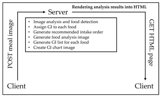 After the food image is sent to the server, the object detection model detects the food objects and identifies the food names and bounding boxes. Subsequently, these GIs are obtained from the GI database or estimated based on the corresponding food categories. The food information for the food names, the GIs, and the bounding boxes are organized in JSON format as shown in Figure 8. The user-uploaded image is immediately removed from the server after analyzing the food information. Figure 9 shows the data flow between the server and client for food analysis. After that, the food information is sent to the client. The client generates a HTML page using HTML5 and CSS3 that visualizes the food types, GIs and the recommended food intake order, as shown in Figure 10.
