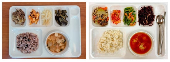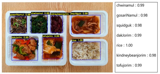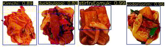 In order to create datasets for experiments, we manually captured 523 Korean meal images over a certain period while also collecting the corresponding food types. The bounding boxes of the foods in the captured image were manually labeled using LabelMe []. Figure 11 shows the samples of the meal images. To increase the amount of food images and balance the distribution of food items across categories, we also utilized 1150 Korean food images provided by an open database (AI-HUB) [], including labels with bounding boxes and food types. Of the collected images, 1339 images were utilized as the training set, 167 images were designated as the validation set for cross-validation, and the remaining 167 images were used as the test set. Furthermore, data augmentation was applied to prevent overfitting, increasing the size of the training set to 5356 images. Table 4 presents the food item information for the experiments.