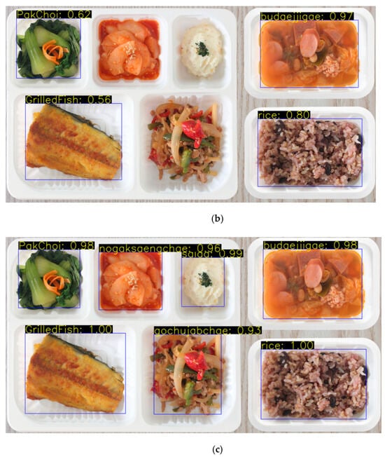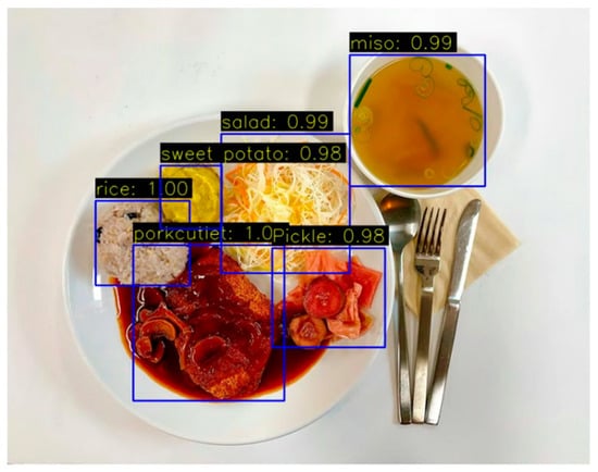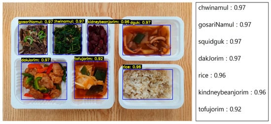 Table 5 shows the model performances for Mask R-CNN and YOLOv11. YOLOv11 was twice as fast as Mask R-CNN for the food detection. In Table 5, ±symbols indicate the ranges of the detection times. The differences in IOU and accuracy were approximately 0.5% and 7%, respectively. In terms of object detection performance, YOLOv11 demonstrated slight improvement over Mask R-CNN. Figure 12 and Figure 13 show the food detection results including bounding boxes, food types, and detection scores by Mask R-CNN and YOLOv11, respectively.