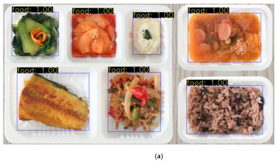 It is impractical to train the model on whole food types due to limitations in food data collection. Therefore, the food detection model may sometimes not detect some foods which were not included in the training. For addressing this issue, a food detection model is additionally introduced using a single common label for all food types. The model using the common label detects foods through common features of foods. Therefore, it can accurately detect foods whose types are not trained. Figure 3a,b show food detection results through the detection models trained with the multi-class labels for food types and the common label, respectively. Whereas the model trained with multi-class labels detects only rice, the model trained with the common label detects all food objects.