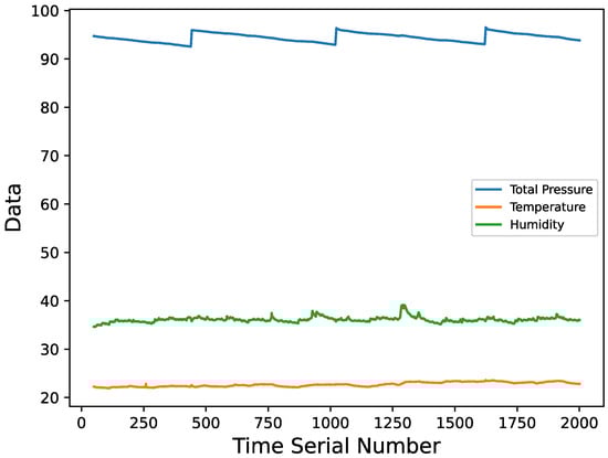 The dataset in this study is from the record of various parameters of a manned spacecraft during a mission. The parameters mainly include total pressure (kPa), temperature (°C), and humidity (relative humidity, %). Notably, due to confidentiality requirements, only a part of the data is shown in this paper. Figure 2 presents a part of the original data of the spacecraft telemetry dataset that we use.