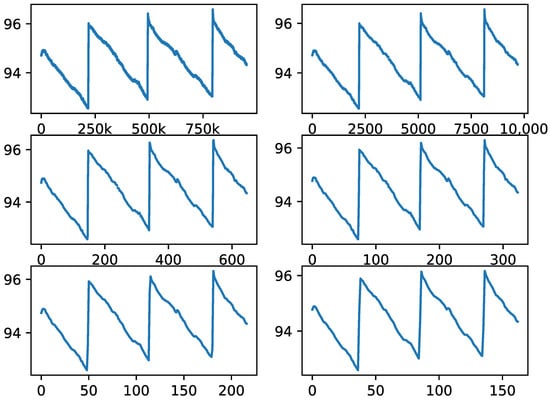 The most commonly used methods for dealing with missing data points include imputation and deletion. Generally, we prefer to keep rather than delete data to avoid information loss. Interpolation is a commonly used prior method with expert experience to determine the value of missing data points. For example, linear interpolation requires a certain linear fitting relationship between missing data and neighboring points. Considering the characteristics of spacecraft telemetry data, using interpolation to fill in the missing data is appropriate. Figure 3 shows the distribution of data at sampling frequencies of 0.5 s, 5 s, 1 min, 15 min, 30 min, 45 min, and 1 h. As the sampling frequency decreases, the distribution of the data becomes smoother.