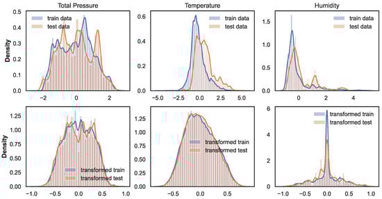 Effect of mean instance normalization on distribution of total pressure, temperature, and humidity data. The first row shows the data distribution of the original training and test data, and the second row shows the distribution transformed by MeanIN.