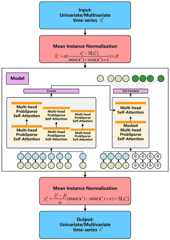 It shows the overview of informer with MeanIN in Figure 6. Each sample sequence is subtracted from the mean of the sequence and later divided by the difference between the maximum and minimum values in the sequence, and finally mapped to the same vector space by a layer of an affine transformation. Informer only takes the transformed sequence as input and outputs its predicted values, which are obviously not the original data distribution. Therefore, the second step of MeanIN is to map the output sequence back to the original distribution by the inverse operation of Equation (6) to obtain the final output.