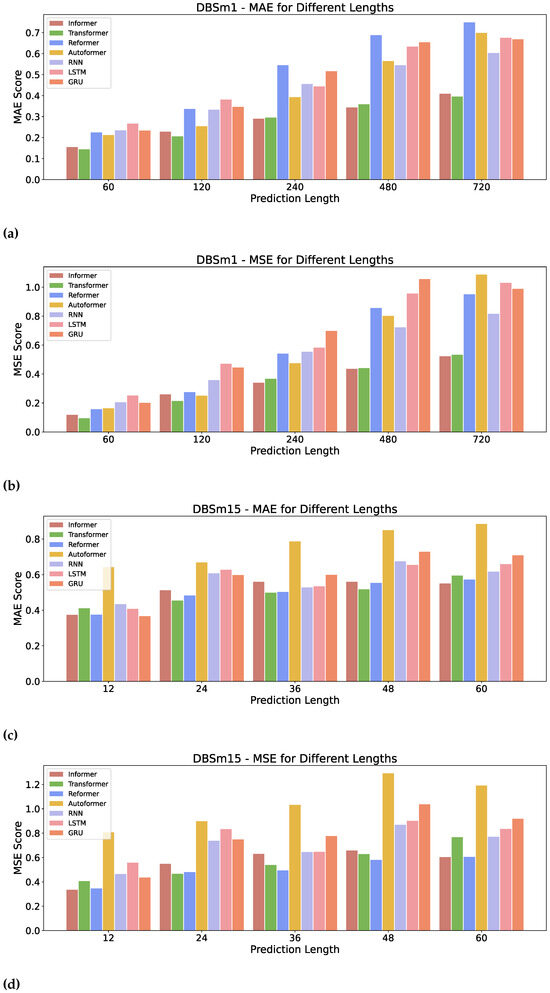 Performance comparison of different models (informer, transformer, reformer, autoformer, RNN, LSTM, and GRU) on time series prediction tasks. (a) MAE scores for different prediction lengths on the DBSm1 dataset. (b) MSE scores for different prediction lengths on the DBSm1 dataset. (c) MAE scores for different prediction lengths on the DBSm15 dataset. (d) MSE scores for different prediction lengths on the DBSm15 dataset.