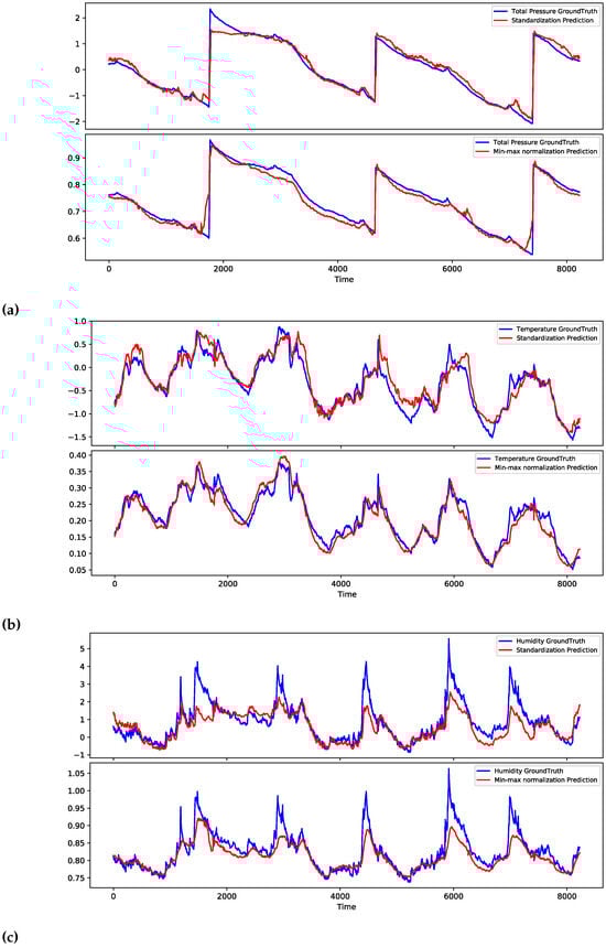 Here, we directly observe the effects of the dataset scaled by different methods. The comparison of using standardization and min–max normalization is shown in Figure 8. The experimental results indicate that min–max normalization performs slightly better than standardization. As shown in Figure 8a,b, both standardization and min–max normalization fit the curve of the data well on the more regularly varying total pressure data and temperature data. However, the irregular fluctuations of standardization bring about greater errors. This is more clearly reflected in the humidity data.