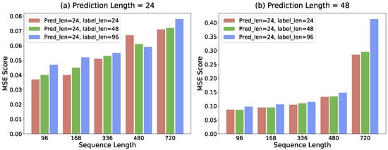 We find that adopting start tokens of different lengths greatly impacts the model’s prediction results. We compare three tokens of different lengths to observe the specific effects when the prediction length is 24 and 48. The result is shown in Figure 9. When the prediction length is 24, the MSE error increases instead with increasing label length, but the opposite result appears when the sequence length is 480. At a prediction length of 48, the MSE error maintains a consistent pattern of variation.