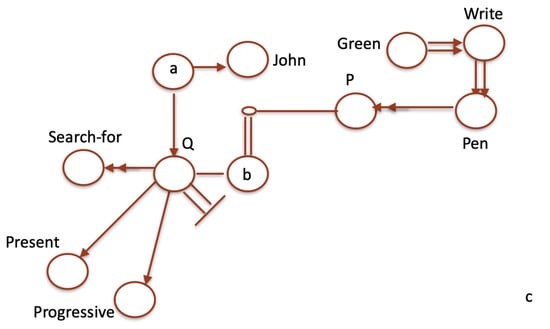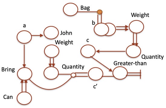 In the last equation, applies to the predicate within parentheses, and Greater_c’(c) means that: “The weight c (of the bag) overcomes , which is any weight that a can bring”. Figure 6 visualizes the representation of Table 16.