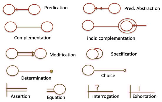 Logical symbols of FLL can be reduced to 20. No variable symbols are present, but individual constants …possibly indexed, and predicative constants or class constants (possibly indexed). Table 23 summarizes the FLL operators. Figure 7 will show the interlingual character of FLL representations, and Figure 8 provides a visual representation of FLL operators.