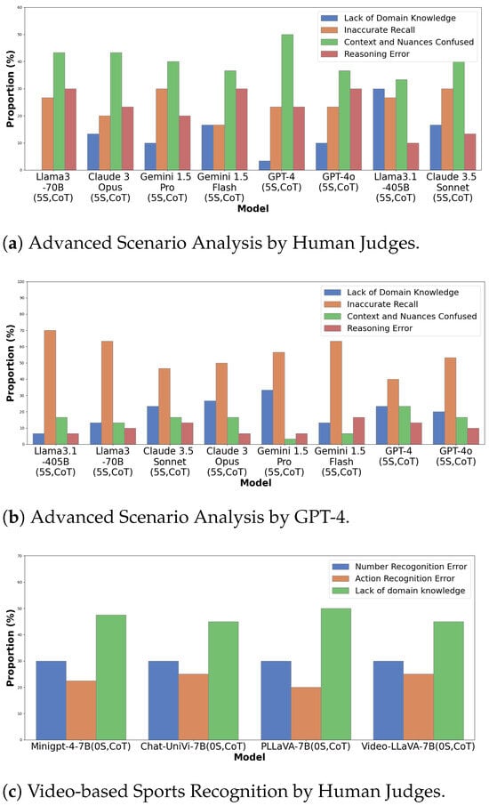 To investigate the performance limitation of LLMs and VLMs, we conducted a detailed analysis across all three tasks. For each task, we sampled incorrectly answered questions and their responses from all models. We sampled 30 incorrectly answered questions for Advanced Scenario Analysis and 40 incorrectly answered for Video-based Sports Recognition. Each response was categorized into a distinct error type and further analyzed by human judges. A total of four researchers participated in the error categorization.