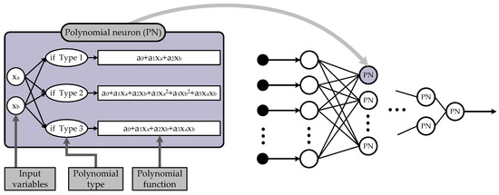 Figure 2 illustrates the basic structure of polynomial neurons and polynomial neural networks. In this figure, PN denotes the type of neurons, where and represent the input variables, and indicate the coefficients of the polynomials.