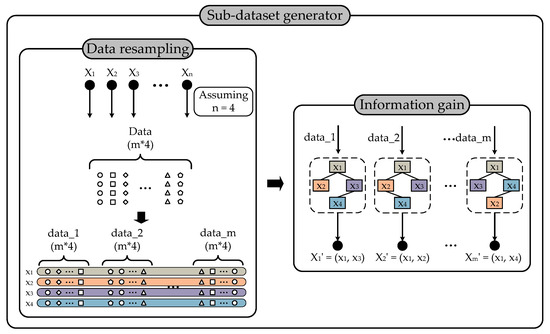 Inspired by the random forest (RF) algorithm, we constructed a sub-dataset generator using two components, as illustrated in Figure 3. In the first component, random sampling is employed to handle the rows of the data, where M random sub-samples are obtained. The second component processes the columns of the data, using information gain (IG) [30] to evaluate the importance of each feature. The feature with the highest information gain is selected as the decision feature in the decision tree, as shown in the figure.