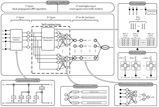 The OPNN-T comprises two distinct types of neural networks: long short-term memory networks, which are based on deep learning methods, and polynomial neural networks. The proposed OPNN-T architecture is illustrated in Figure 4, where the temporal feature enhancement module is designed to capture the temporal features of time series data. The PNNC is employed to flexibly approximate the relationship between inputs and outputs and to capture the inherent uncertainties within the data. A generator produces sub-datasets of varying sizes and feature quantities, self-optimizing the dataset size, features, and polynomial types.