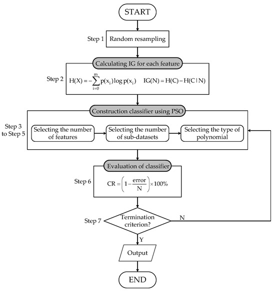 [Step 6] Evaluate the actual performance of each subset. The classification accuracy (CR) is used as the fitness value for the PSO objective function, and serves as the evaluation metric. The can be expressed in the following form: