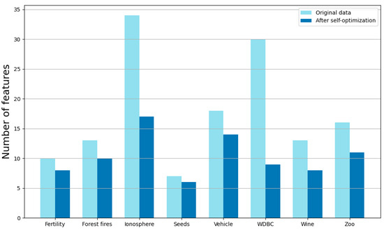 To validate the performance of the OPNN, we conducted experiments on eight different machine learning datasets obtained from the UCI database. The datasets were divided into a 60:40 ratio, with 60% of the data allocated for the training set and 40% for the testing set. Table 2 summarizes the relevant characteristics of these eight datasets, including the number of samples, the number of features, and the number of classes. The optimization includes selected features, the size of the chosen sub-dataset, and the type of polynomial. Table 3 presents the parameter results of the classifier after optimization. Figure 6 compares the number of original features with the number of features selected after optimization.