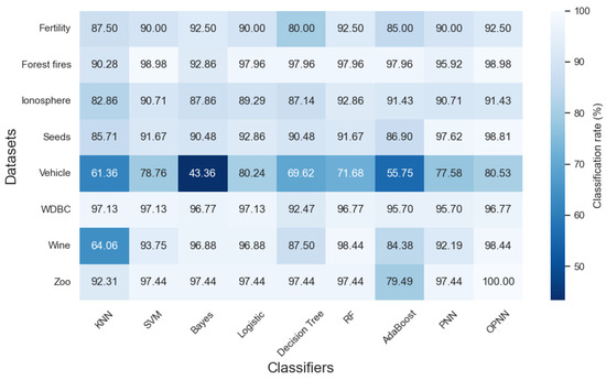We compared the experimental results with those of the traditional models and other related models proposed by researchers. To evaluate the performance of the proposed model, we selected eight public machine learning datasets from the UCI benchmark for comparison. The models compared with the PNN and the self-optimized PNN (OPNN) are the latest standard machine learning classifiers available in scikit-learn [33]. The UCI datasets can be accessed at https://archive.ics.uci.edu/ml (accessed on 21 January 2025).