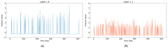 Time series characteristics with different labels in the earthquake dataset. (a) A sample with label = 0 in the earthquake dataset. (b) A sample with label = 1 in the earthquake dataset.