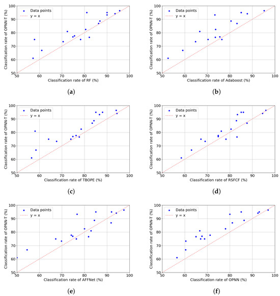 Comparison of the classification rates between OPNN-T and RF, AdaBoost, OPNN, TBOPE, RSFCF, and AFFNet. (a) OPNN-T vs. RF. (b) OPNN-T vs. AdaBoost. (c) OPNN-T vs. TBOPE. (d) OPNN-T vs. RSFCF. (e) OPNN-T vs. AFFNet. (f) OPNN-T vs. OPNN.