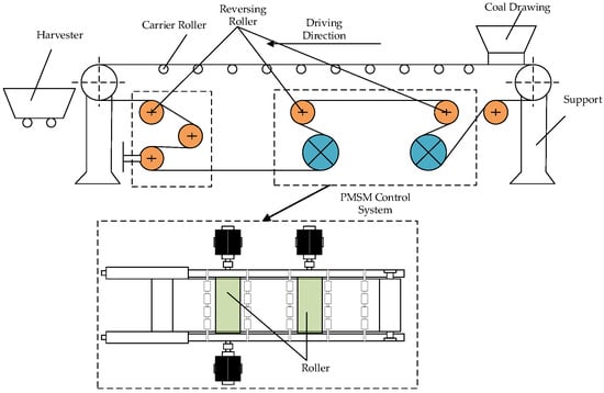 The continuous development of modern industrial intelligence has rendered the control of a single motor incapable of meeting the high-performance requirements for equipment in modern industries. Consequently, multi-motor coordinated control systems have become a focal point of research in the field of modern industry. Among these, the belt conveyor, which is the principal equipment used for underground coal transportation in coal mines, is undergoing a process of intensification and automation. In the contemporary era, belt conveyors are predominantly operated by asynchronous induction motors in conjunction with intermediate transmission devices, such as reducers and hydraulic couplings. The belt conveyor drive system is constrained by a number of limitations, including low efficiency, unstable starting and difficulty in starting with heavy loads []. In comparison, the Permanent Magnet Synchronous Motor (PMSM) has a working principle that is distinct from an asynchronous motor. The PMSM exhibits the characteristics of low speed, large torque and high power. It does not require an intermediate transmission device and can directly drive the belt conveyor, thus improving the transmission efficiency and reliability of the system.