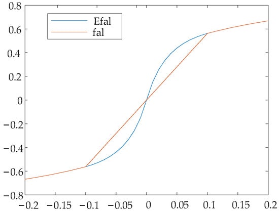 In order to verify the control performance of the function, the parameters , and were taken in combination with the tuning experience of the ADRC. The comparison results were obtained by drawing the function curves of and in MATLAB, as shown in Figure 4.