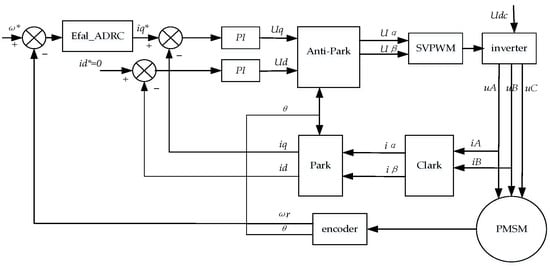 The overall structure diagram of a single PMSM speed regulation system based on the improved nonlinear function Efal_ADRC is presented in Figure 5.