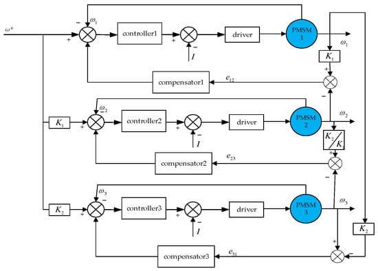 As illustrated in Figure 6, the core of the multi-motor synchronous control system comprises three principal components: the motor drive system, the synchronous error compensator, and the controller. In response to the action of the synchronous error compensator, the detected error information is transmitted with precision to the corresponding motor. Concurrently, the multi-motor synchronous driver also receives this error signal in a synchronous manner. The compensation based on the error signal can enhance the synchronization and stability of the system, while reducing the disturbance of the motor speed caused by external forces. Figure 7 illustrates the three-motor ring coupling compensation structure [].