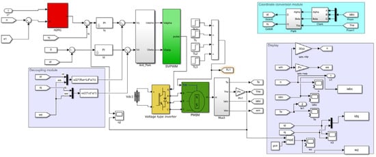 In order to verify the effectiveness of the proposed Efal_ADRC on the dynamic and static characteristics and anti-interference ability of the motor speed control system, this paper employs a three-motor system model. Figure 9 shows the single motor simulation model built on the basis of Figure 5. It includes the speed loop controller, current loop controller, display module, coordinate transformation module, decoupling module and so on. Figure 10 shows the simulation model diagram of the Efal_ADRC controller, built according to Figure 4 and Formulas (11) and (12).