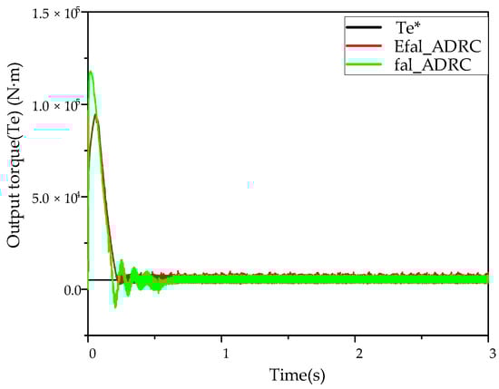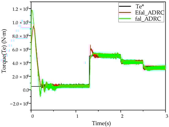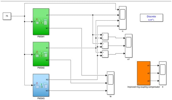 On the basis of the above model, the simulation model of the three-motor control system based on the improved ring coupling control is built, as shown in Figure 11. Among the controllers employed, the PI controller is utilized in the current loop, while the traditional PI controller, ADRC, and Efal_ADRC are deployed in the speed loop. Simulation experiments were conducted to compare the master-slave structure, the deviated coupling structure, the ring coupling structure and the ring coupling structure of the improved compensator. The objective was to ascertain the superiority of Efal_ADRC-based ring coupling control in comparison to alternative control methodologies.