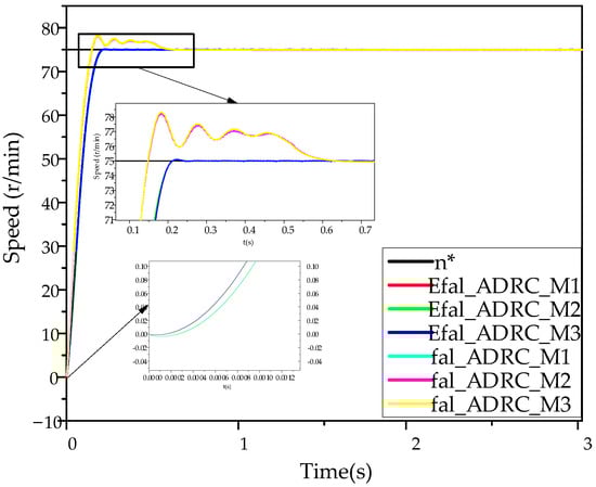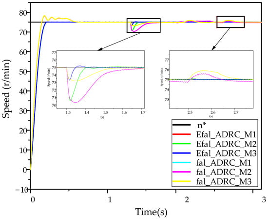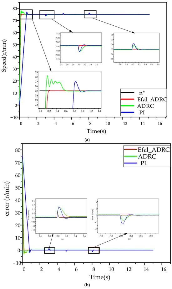 The motor speed, n = 75 r/min, is set and the motor is started without a load. The simulation time is set to 15 s. After applying of load at 3 s, a load is subtracted at 5 s and a load is subtracted at 8 s. The simulation results for the Efal_ADRC, ADRC, and traditional PI controller are presented in Figure 12.