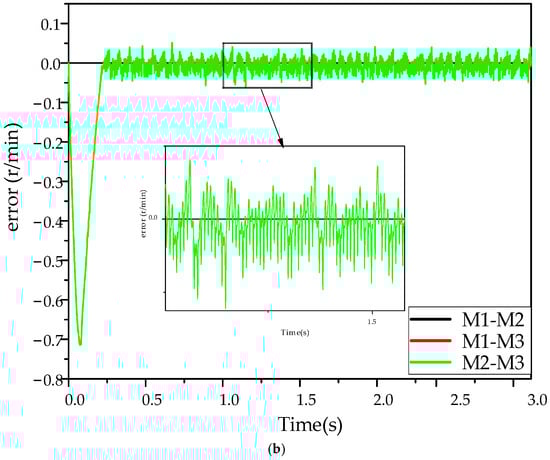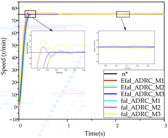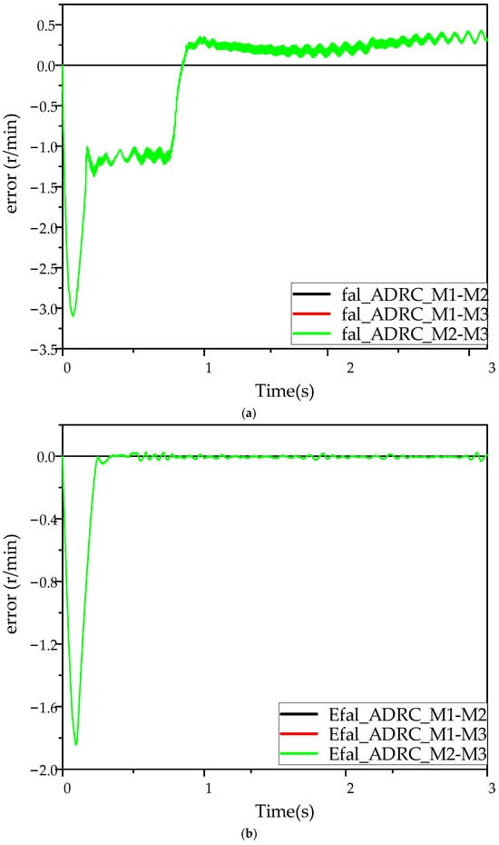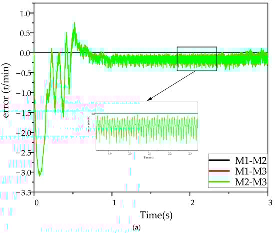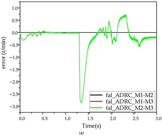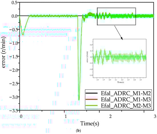 As the system is not operating in real-time synchronization, it is necessary to acknowledge that the rotational speeds of the three motors will differ in actual operation. Figure 13, Figure 14 and Figure 15 illustrate that, under no-load conditions, the Efal_ADRC controller reaches stability within 0.25 s, while the ADRC controller reaches stability at 0.65 s. The maximum speed difference of the Efal_ADRC controller is less than 0.5 r/min, approaching 0, and its steady-state error fluctuation is minimal. It can thus be concluded that the three motors under the Efal_ADRC controller exhibit superior speed and stability under no-load conditions.