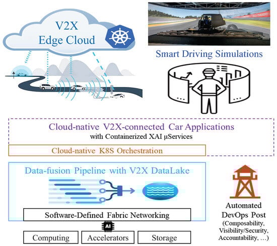 This architecture integrates cloud-native orchestration for scalable AI deployment, DevSecOps automation for secure and efficient operations, SiLS simulation environments for realistic validation, and a data-fusion pipeline for enhanced AI transparency and explainability. These elements ensure seamless integration, scalability, and resilience across cloud and edge environments, thereby enabling the effective deployment and management of AI-driven V2X applications in dynamic vehicular contexts.