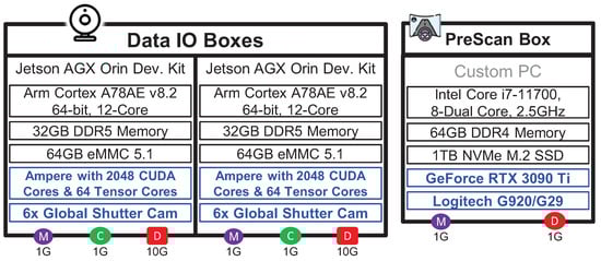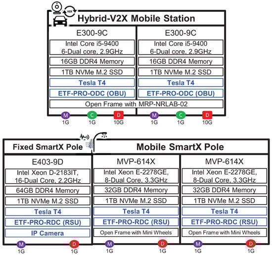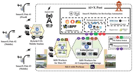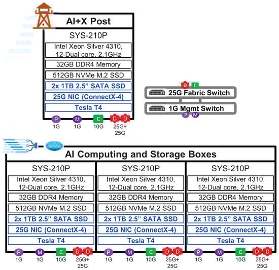 Figure 4, Figure 5 and Figure 6 illustrate the overall hardware configuration of the V2X-Car Edge Cloud framework, including the physical devices that host the K8S containers described in Section 4. These physical devices, or “boxes”, serve as the infrastructure for running distributed AI workloads, managing V2X data, and ensuring operational efficiency. The proposed system comprises AI+X Post Box, multiple AI Computing and Storage Boxes, and a driving simulation environment (both virtual and real-world).