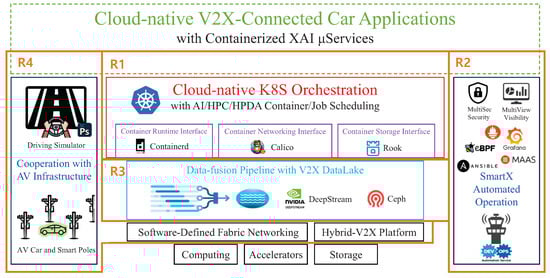 In summary, the conceptual architecture of the V2X-Car Edge Cloud is designed to address four key requirements: cloud-native edge intelligence (R1), secure and automated operations (R2), data-fusion pipelines for XAI support (R3), and SiLS-Based Service Realization in Hybrid-V2X environments (R4). Each layer and component of the system, including the AI Computing and Storage Boxes, Data IO Boxes, AI+X Post, and SmartX MultiSec framework, play a critical role in achieving these objectives.