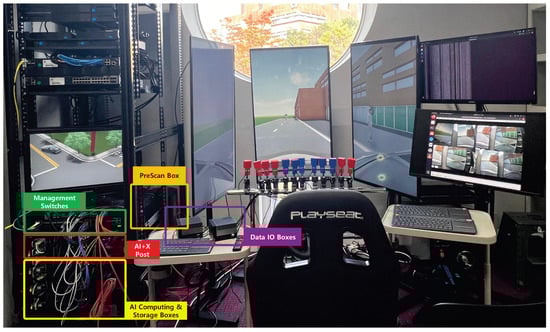 - Virtual Driving Simulation Environment (PreScan Box and Data IO Boxes): The virtual driving simulation environment is built using PreScan, a simulation tool that replicates real-world driving conditions and traffic scenarios. In this setup, the PreScan Box runs the simulation software that shows a virtual driving environment on three tiled displays. The three tiled displays are captured by 12 cameras of Data IO Boxes, which are responsible for collecting and distributing these data to the AI Computing and Storage Boxes for real-time processing. The AI containers deployed on these physical boxes process the simulation data, executing tasks such as object detection and tracking to validate AI models in a controlled virtual environment. The virtual simulation environment allows for thorough testing of AI models and system behavior under various traffic conditions, such as vehicle-to-vehicle communication, emergency response scenarios, and pedestrian detection. The data generated from these simulations provide insights into how the system performs in real-world applications, thereby ensuring the robustness and reliability of AI models before deployment.