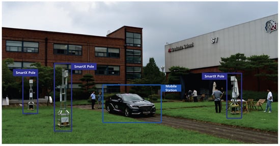 Figure 8 illustrates a proof-of-concept implementation of a real-world driving environment. Three SmartX Poles, which recognize vehicles using V2X communication, are positioned near the road in a triangular formation. A mobile station, which acts as a vehicle, is set up in the middle of the road. In this implementation, we used a real vehicle; thus, we installed station boxes inside the real vehicle instead of using an open-frame cart. The roadside unit (RSU) on each SmartX Pole continuously engages in V2X communication with other RSUs and onboard units (OBUs) within range, constantly updating the status of the SmartX Poles and the mobile station. Unlike conventional V2X communication systems, this environment leverages AI Computing and Storage Boxes to rapidly process and update V2X communication data at the edge. This environment also enables dynamic experiments that are impractical by reproducing these scenarios within a virtual driving simulation environment.