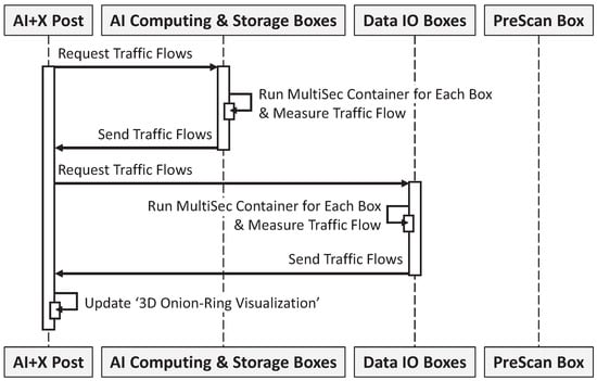 Figure 24 and Figure 25 depict the application of onion-ring visualization to monitor the networking flow in the V2X-Car Edge Cloud system. This visualization provides a layered and hierarchical view of the real-time network activity of the system, facilitating the identification and analysis of communication flows between key components such as the AI Computing and Storage Boxes, Data IO Boxes, and Hybrid-V2X Mobile Station.
