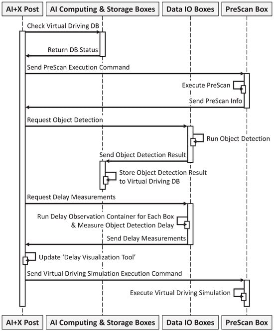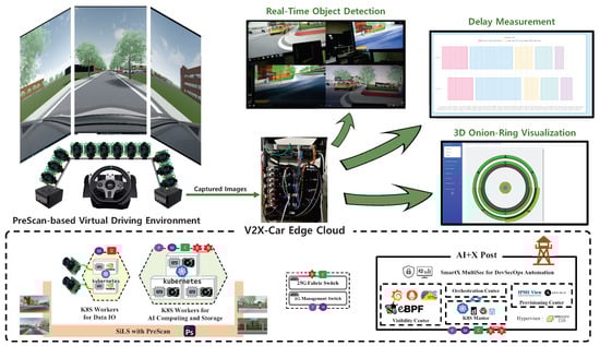 In summary, the physical infrastructure of the V2X-Car Edge Cloud is designed to support the deployment of the K8S containers, as described in Section 4. The AI+X Post Box orchestrates the system, whereas the AI Computing and Storage Boxes execute AI tasks and store data locally. This physical setup ensures that real-time processing, secure communication, and scalable AI workloads are efficiently managed across the network, providing a robust platform for modern V2X applications. By integrating both virtual and real-world components, the V2X-Car Edge Cloud provides a comprehensive platform for AI model validation and system operation under various conditions. The virtual environment allows for controlled testing and model refinement, whereas the real-world environment ensures that the system performs effectively in real-time V2X scenarios.