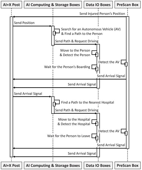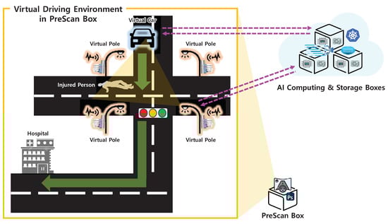 Figure 7 provides a visual representation of the hardware components used in the setup of the V2X-Car Edge Cloud. The figure illustrates the specific devices, including AI+X Post Boxes, AI Computing and Storage Boxes, and Data IO Boxes, allowing for a clear understanding of how these elements physically manifest in the proposed system. In this study, all experiments and validations were conducted in a virtual driving environment. This approach was adopted to simulate realistic V2X scenarios while maintaining a controlled and repeatable setup, ensuring that the functionalities of the system, including data flow, security, and AI model performance, could be thoroughly tested and evaluated. Consequently, the virtual environment serves as a comprehensive platform for validating the effectiveness and robustness of the V2X-Car Edge Cloud architecture.