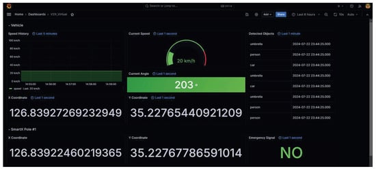 The detected objects are displayed with bounding boxes and labels, allowing operators to continuously monitor the locations and interactions of objects. This capability is vital for assessing the ability of the proposed system to maintain situational awareness in dynamic scenarios. The movement of each detected object and its interaction with other entities, such as the vehicle and SmartX Pole, are updated in real time, providing a comprehensive view of the environment.