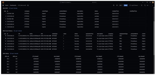 Similar to Figure 18, the dashboard in Figure 19 provides real-time monitoring of V2X communication data in a real-world driving environment. The dashboard incorporates the status of the actual SmartX Poles and the mobile station, providing a detailed overview of the operational state of the proposed system. The OBU Status table at the bottom of the dashboard displays the actual GPS coordinates of the mobile station. In addition, it includes acknowledgment (Ack) signals that confirm successful communication with each RSU. This visualization demonstrates the ability of the proposed system to effectively handle various types of data, including V2X communication data, in future applications.