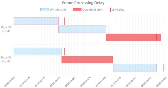 Figure 21 illustrates the total processing time required for each frame captured by the Data IO Boxes during the virtual driving simulation. Each bar represents the end-to-end processing time of a single frame from capture to output. The red vertical markers indicate 50 ms intervals, providing a reference for assessing processing delays in real time.