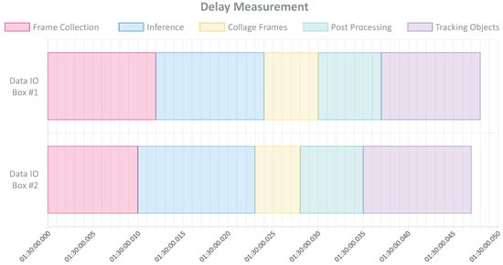 Figure 22 provides a detailed breakdown of the processing delays across individual stages within the frame processing workflow for the Data IO Boxes. Unlike Figure 21, which presents the total processing time per frame, Figure 22 tracks each of the five stages of Frame Collection, Inference, Collage Frames, Post Processing, and Tracking Objects, illustrating the duration of each stage in real-time processing.